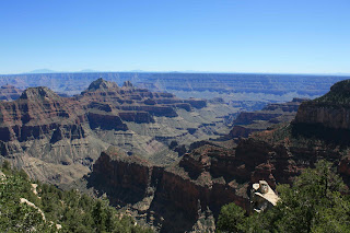 Kaibab National Forest opened onto a meadow that stretched for miles before reaching the entrance of the Grand Canyon. You can view that area of the canyon from the Grand Canyon Lodge, which has been in operation since 1928. Note to self is to go back there, with a designated driver, and have a few beers at the the Lodge's bar and at the Roughrider Saloon. (NB: since the trip's start, I've actually not had any alcoholic beverage.)