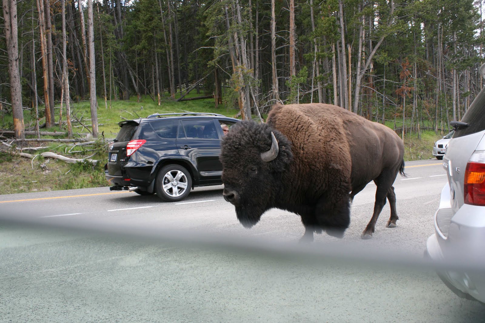 All I could think was "Damn, I have no comprehensive health care! I gotta save my own ass." So, I moved back into the car, snapping the camera away, as the buffalo passed by just 10 feet away and making its way back into the valley.