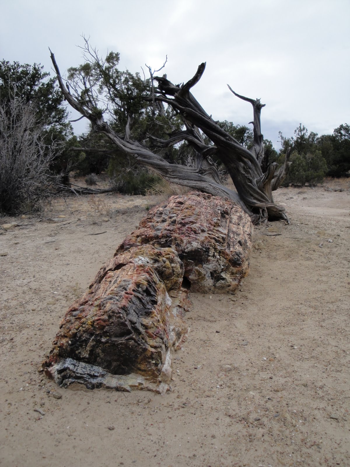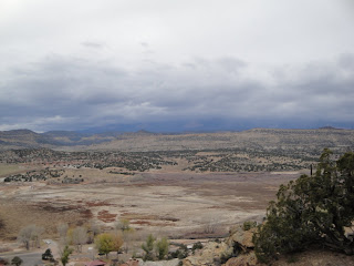 Our hike through the petrified forest wound through a trail that led us about 300 feet up from the parking lot and gave us a nice view of the valley and Escalante. There were a bunch of logs that were exposed, and I'm sure that there are many specimens of petrified wood beneath our feet. The trail looped back toward the parking lot, and we booked our asses out of there to beat the inclement weather. But that was too late anyway. (Before we left Esacalante Petrified Forest State Park, I left $1 in an envelope as fee for the privilege of hiking the trail. It's actually $5, but the dollar was the smallest bill on hand!)