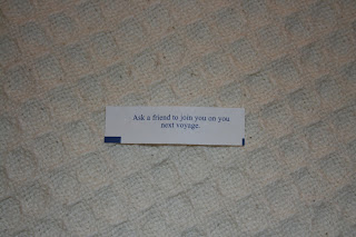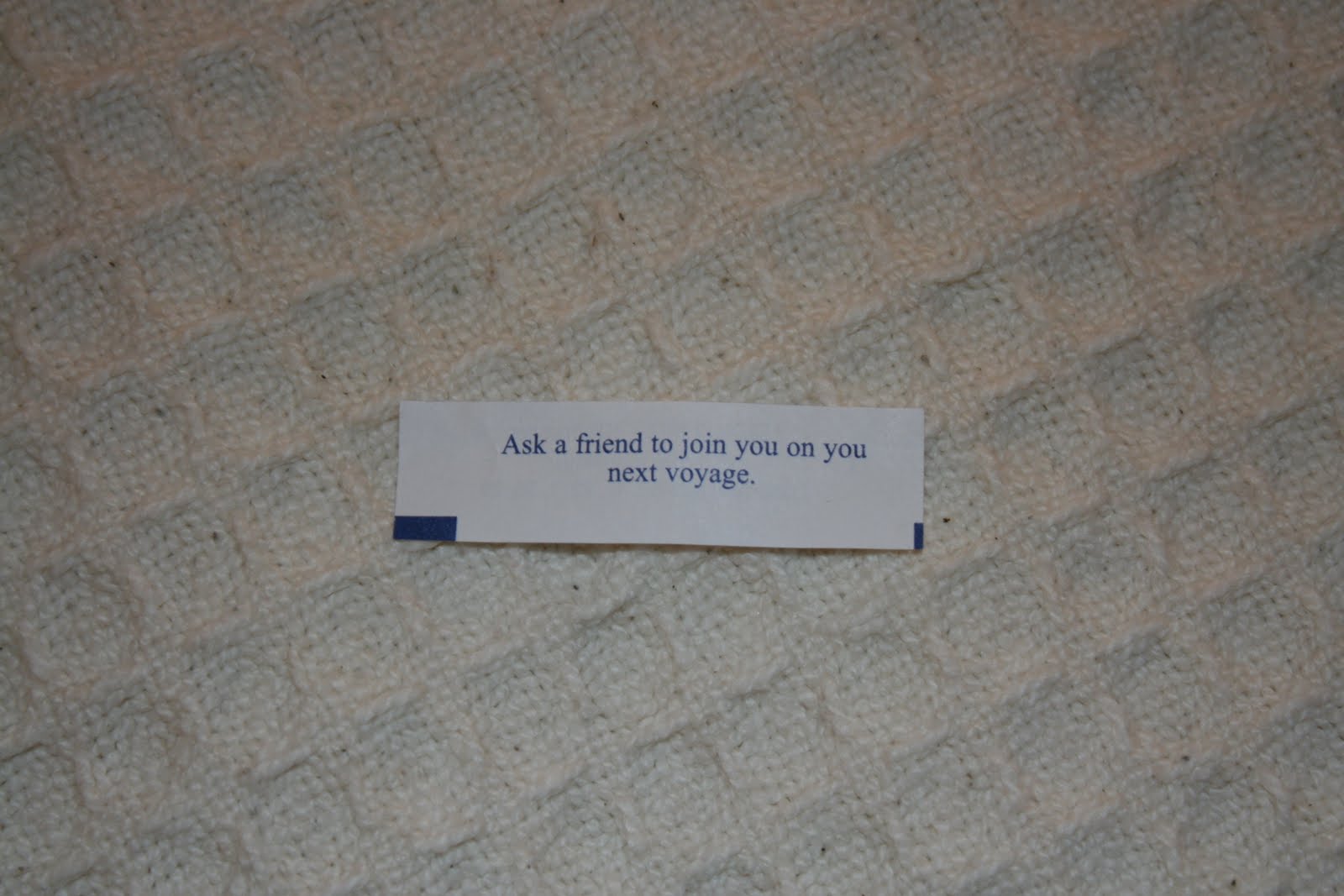 So, to go back, at the penultimate night of that trip, on August 19, I ate at a Chinese restaurant, and a fortune cookie revealed itself to say this, in not-so-perfect English: "Ask a friend to join you on you[r] next voyage."